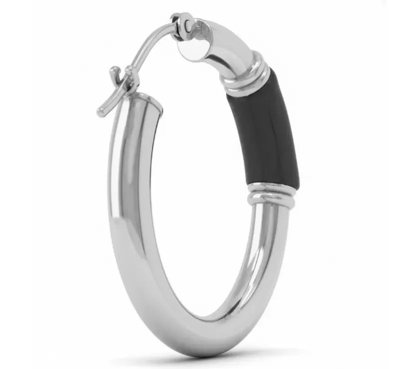 MB Black Enamel Work Round Tube Hoop Snap Earrings in 14k White Gold 2.19 Grams